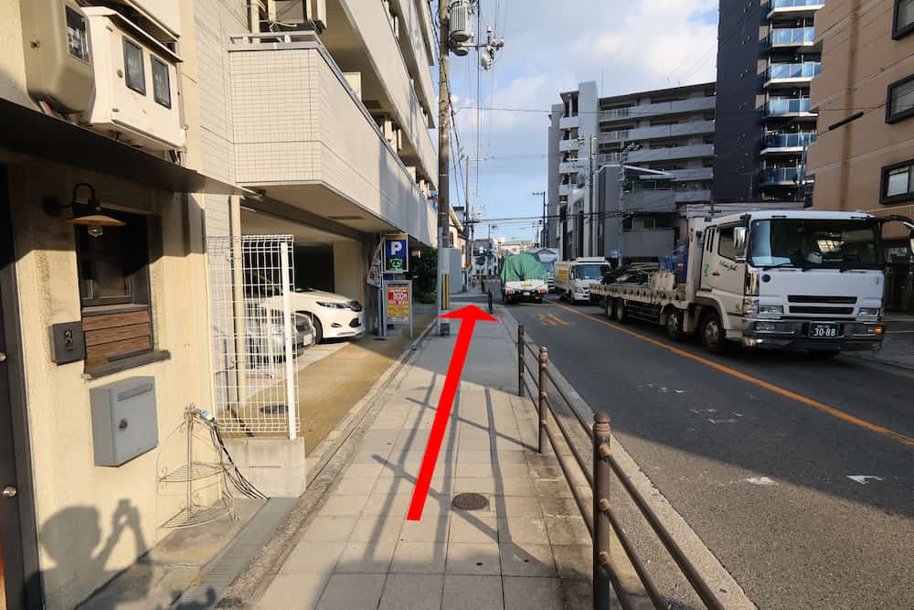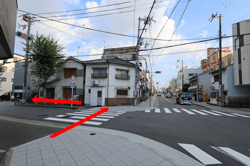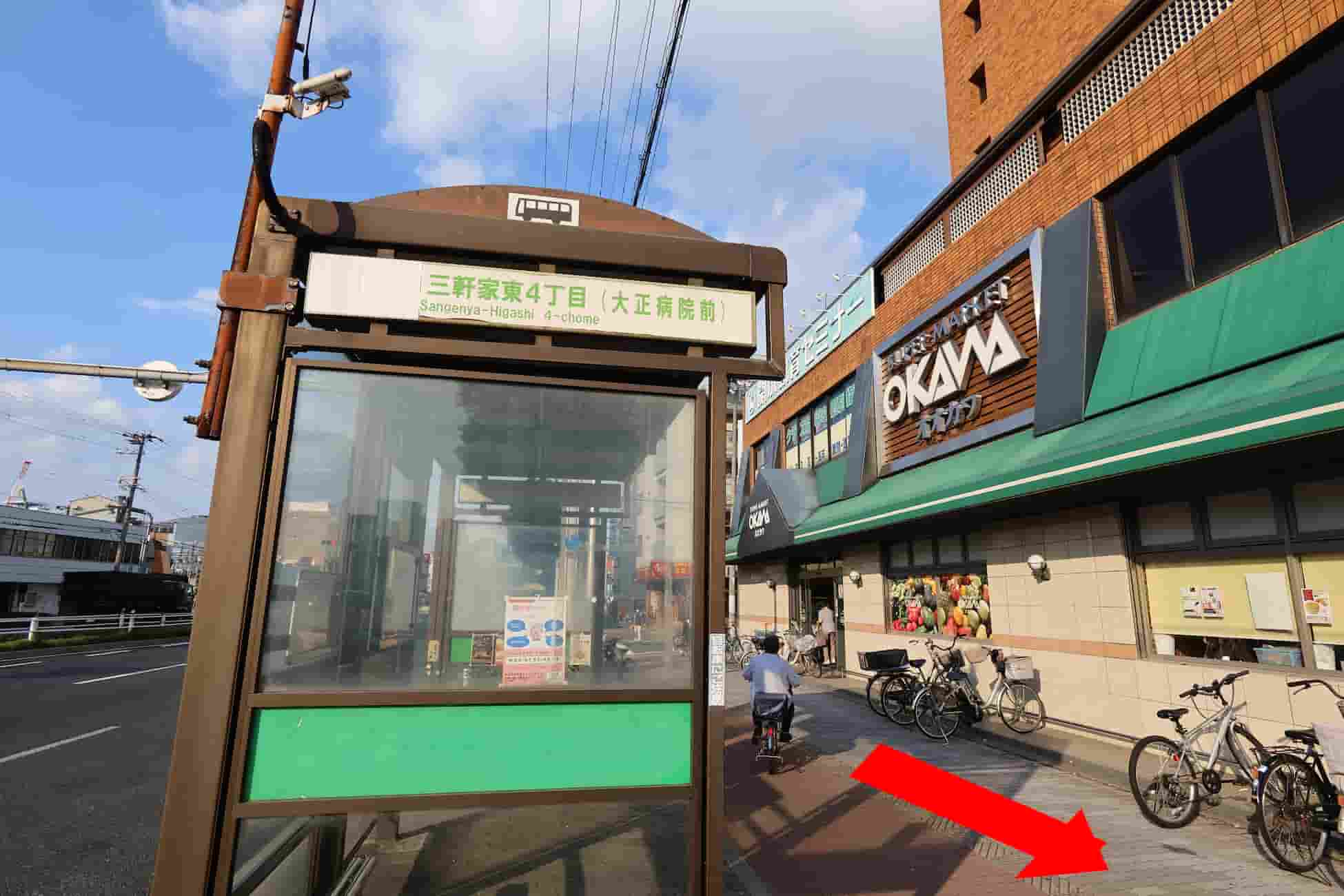 大正駅前のバス停から当店までの道のり