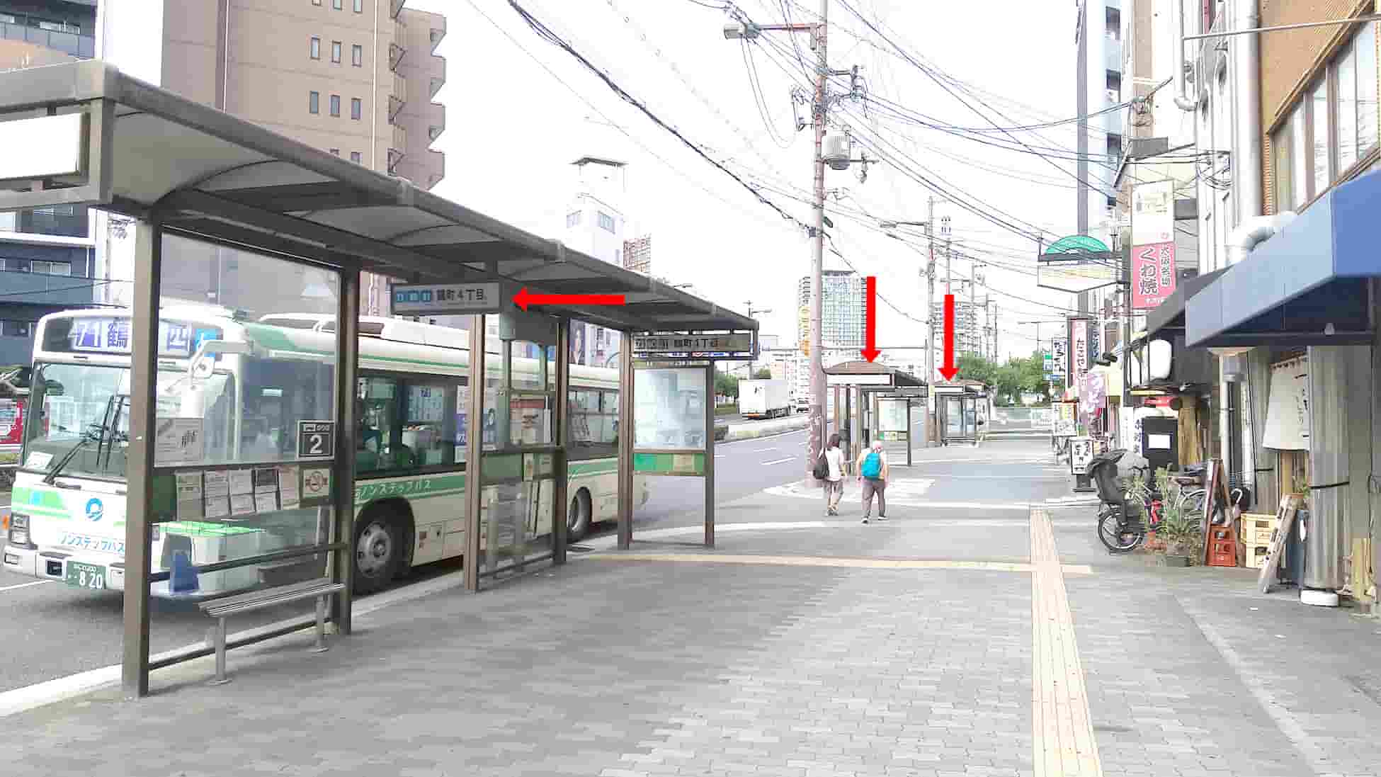 頻繁に来るのは、鶴町四丁目行70、71、91号で駅の手前のバス停がおすすめです。