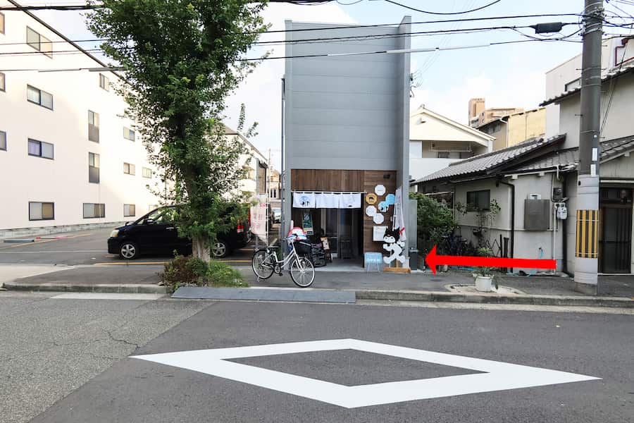 横断歩道を渡り、左へ曲がると、右側にお店が見えます